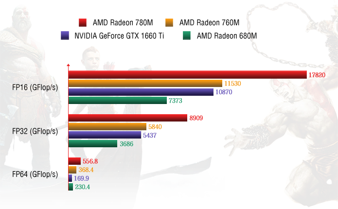 全新的 RDNA3 集成图形架构显示,与上一代 RDNA150 相比,浮点性能提高了 2%。结合四通道LPDDR5x-7500 MT/s内存,内存带宽也显著增加。与NVIDIA GeForce GTX 1660 Ti相比,改进了约70%,像素和纹理填充率也翻了一番。