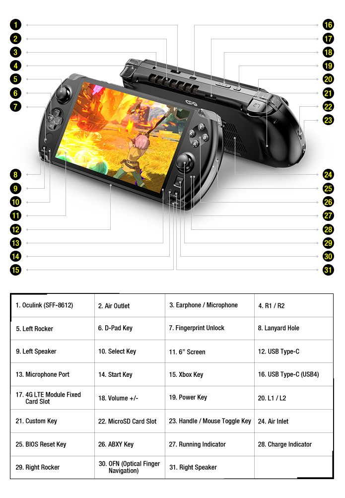 WIN 4整合了一个Oculink(SFF-8612)女性端口,提供带宽为63Gbps的PCIe直接连接。它完美支持GPD G1移动图形扩展坞,提高游戏体验和工作效率。