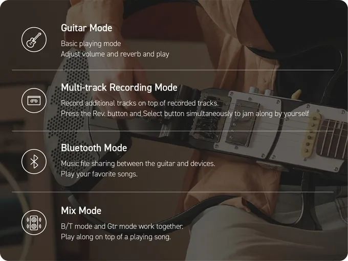 MOGABI Electric 还允许你通过蓝牙连接到计算机、智能手机等设备。通过打开蓝牙配对模式并使用混音模式,甚至可以和著名艺术家的歌曲一起演奏。凭借一些酷炫的伴奏音轨,你可以独自一人演奏如同摇滚乐队一般。享受二重奏、四重奏等多重演出带来的乐趣。