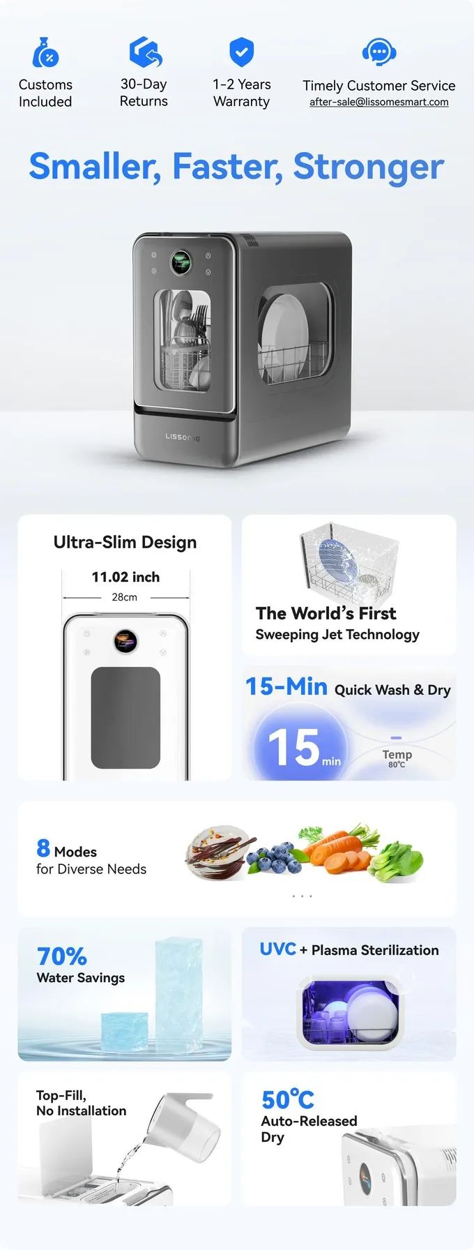 快速的15分钟清洗周期,配合45,000 Pa的水流喷射,迅速带来闪亮干净、干燥的餐具。LISSOME R1使洗碗从繁重的工作变为便利,并防止细菌滋生,帮助你保持厨房的卫生。