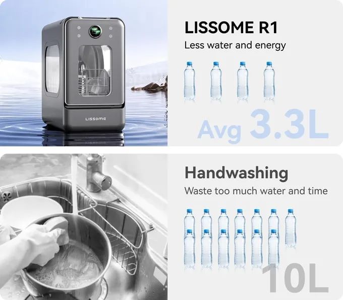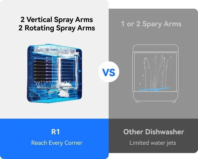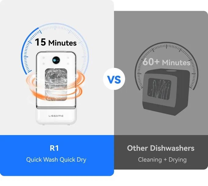 LISSOME R1,紧凑型洗碗强者,简化了清洁流程。凭借其超薄设计、四个喷臂和创新的扫射喷流技术,R1轻松清洁碗碟,同时节省你的时间、水和空间。