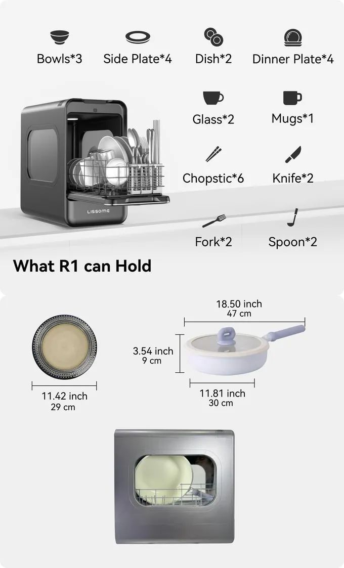 R1可容纳多达28件餐具、直径达12英寸的盘子和10英寸的炒锅,使清洗变得轻松自如。非常适合2-4口之家的使用,R1能够处理从日常碗碟到宝宝用品、玩具乃至水果和蔬菜的各种清洗需求。