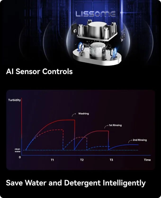 R1配备自我开发的AI传感器用于水透明度识别。通过大数据训练,准确检测水的浑浊度,提供不同油脂水平的见解。AI传感器灵活管理喷臂的清洁路径和水压,通过分别调节电机和水泵速度来增强水流覆盖。