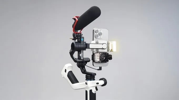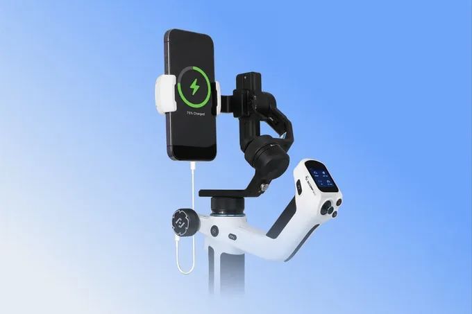 SCORP M2手机云台增强了与智能手机和相机的兼容性,为用户提供了更大的灵活性以扩展其设备配置。你可以将多种设备连接到云台,包括灯光、麦克风、移动电源、硬盘和冷却风扇,从而实现更多样化的创意可能性。