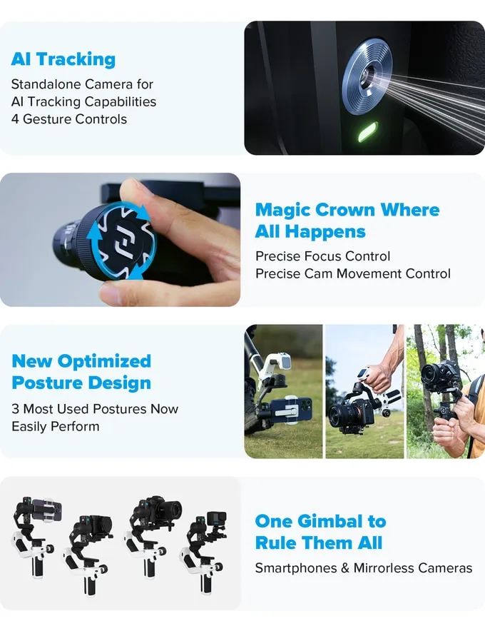 SCORP M2手机云台配备集成的独立AI跟踪模块,确保你的照片或视频中的主体始终在镜头内,无论他们如何移动。它无缝支持多种设备,并提供多种手势控制,增强了你设备的智能化。