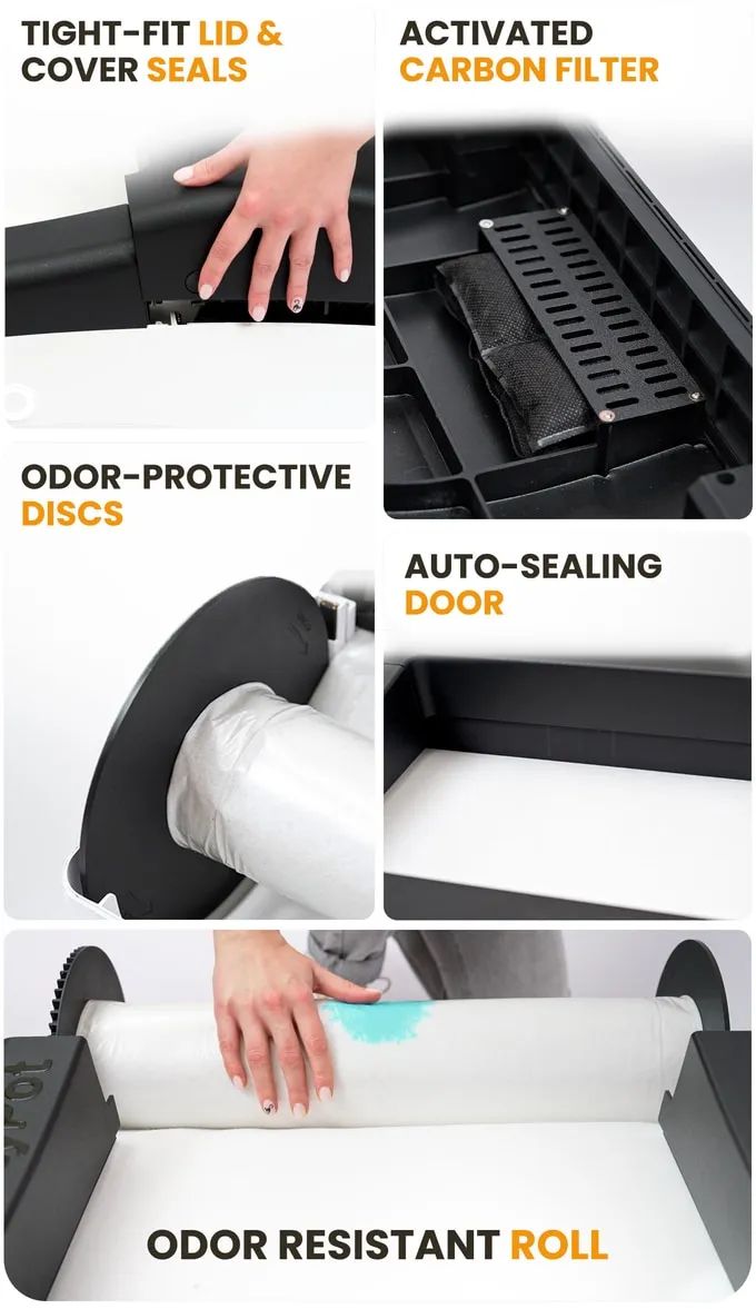 在每次清洁周期后,废物会被包裹并密封在一个特殊容器中,以锁住气味。防臭垫卷层防止气味从卷筒中逸出,而特殊的侧盘则提供额外保护。