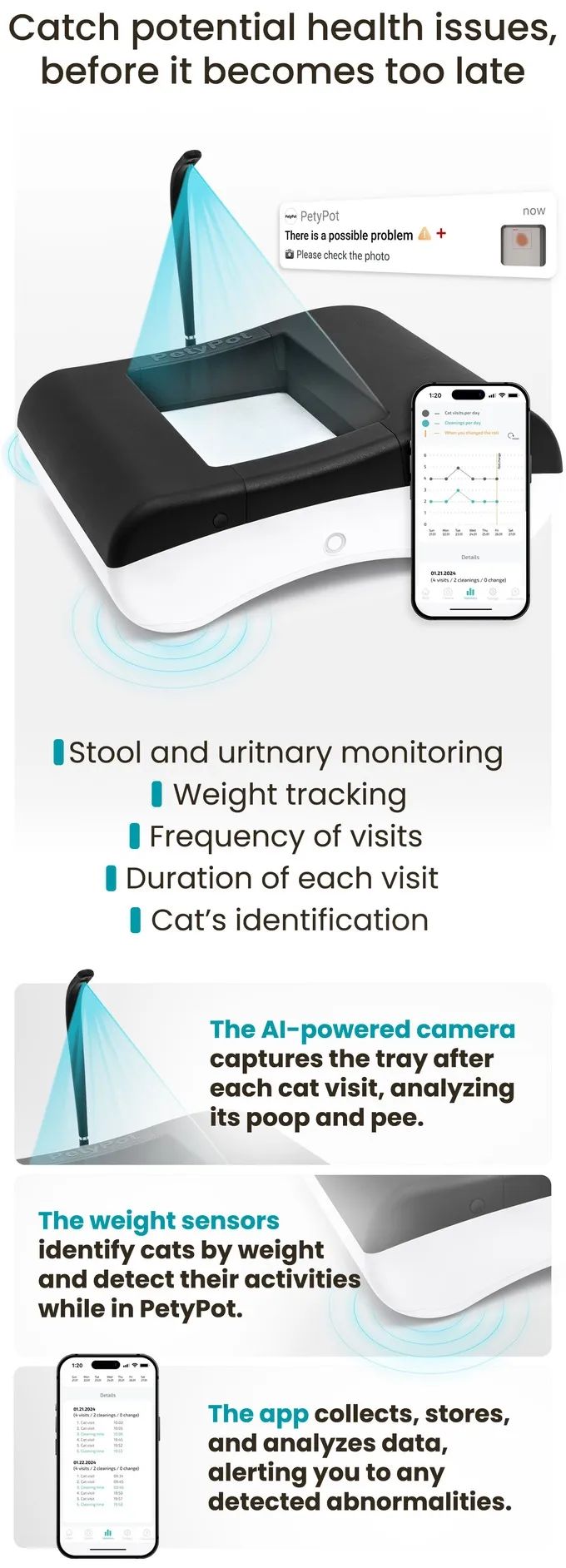 PetyPot AI驱动的健康监测系统(AI HMS)跟踪你猫咪的健康,寻找异常并创建全面的健康数据库,为你的兽医提供最新的诊断信息。