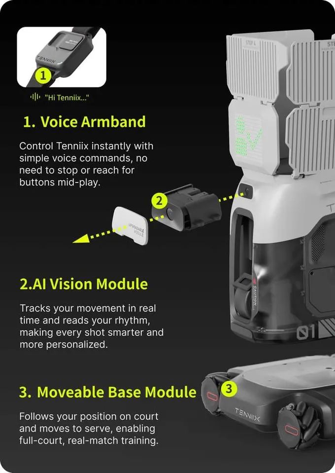 Tenniix 通过语音指令实现即时调节,配合LED反馈确认,结合语音控制臂带和智能系统,成为一款能够听取指令、协助训练并提升比赛水平的专业教练,提供无缝、直观的交互体验。