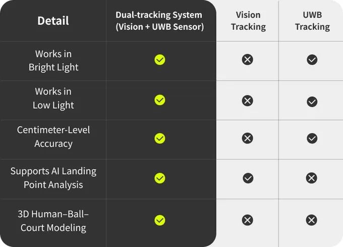 采用双定位系统,结合视觉追踪和UWB传感器,克服单一系统的局限,实现厘米级精度,实时追踪运动员和球的位置,捕捉每一次落点,智能响应,提升训练效果。