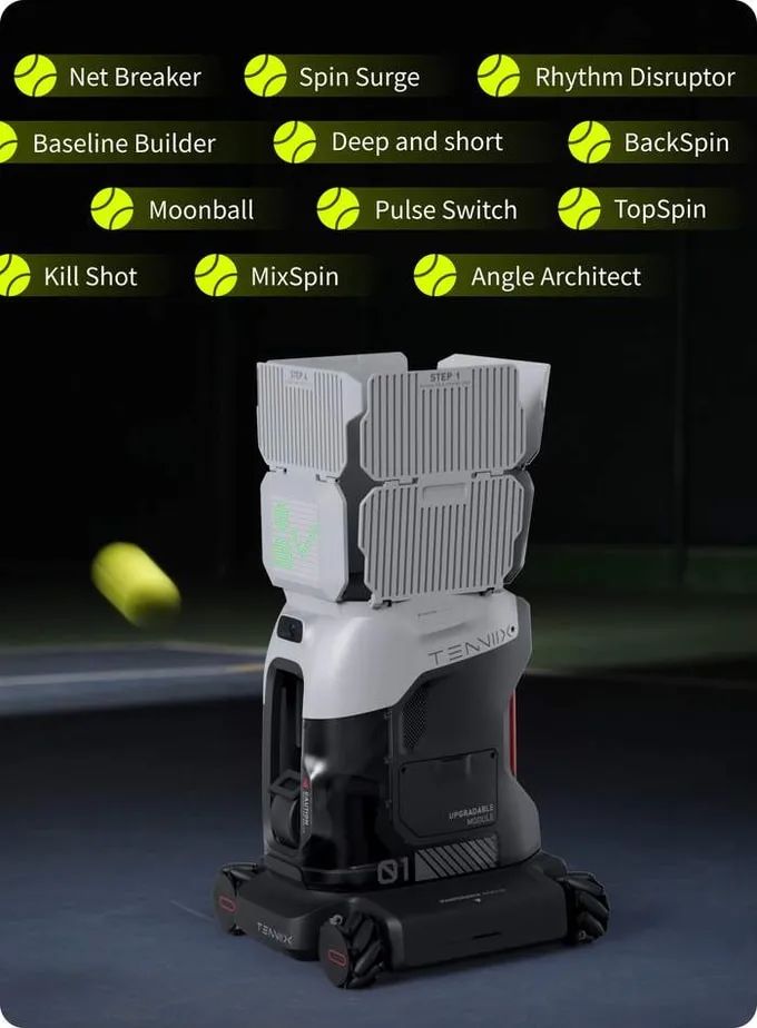 Tenniix能读取你的动作,策略性地模拟真实对手,发出挑战极限的击球。其先进的+UWB混合视觉系统、AI处理器与意图匹配技术协同工作,营造出真实、响应灵敏的对打体验。