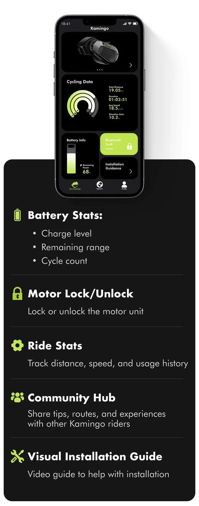 通过蓝牙连接智能手机,你可以从Kamingo应用中获取详细的续航信息、远程锁定/解锁电机、管理设置等功能。