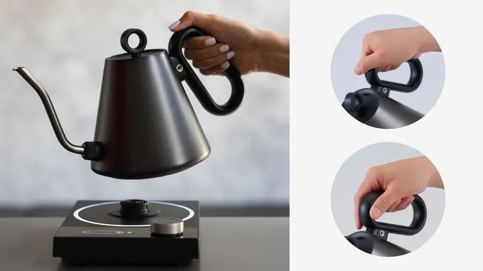 通过观察咖啡师操作,发现最费力的瞬间不仅是控制水流,更是倒水结束时的提起动作。使用手柄设计不合理的水壶,咖啡师在长时间使用后常会感到拇指根部至手腕的疲劳。这种疲劳源于持续施加的控制力以及提起和停止倒水的努力。