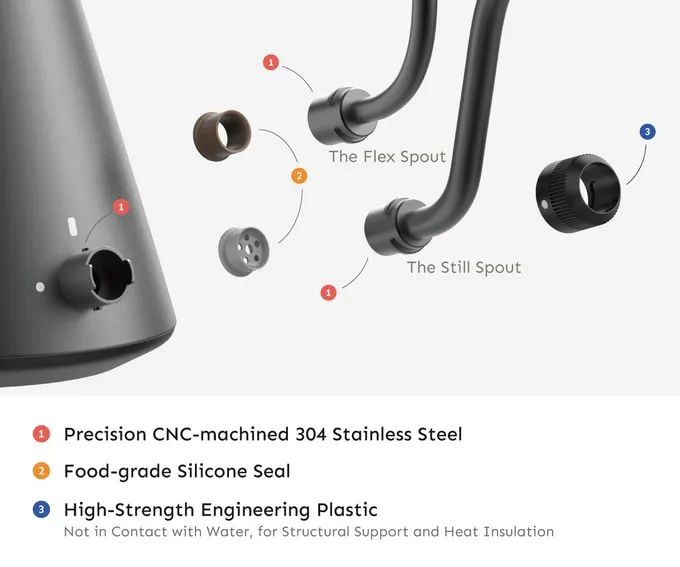 Palatti Enso标配两款出水嘴:Still和Flex,供你探索不同的倒水风格。还可以更换密封圈,配合或不配备内置限流器,开启两种额外的流速模式——一是超过50克/秒的高速流,二是更慢、更可控的倒水。