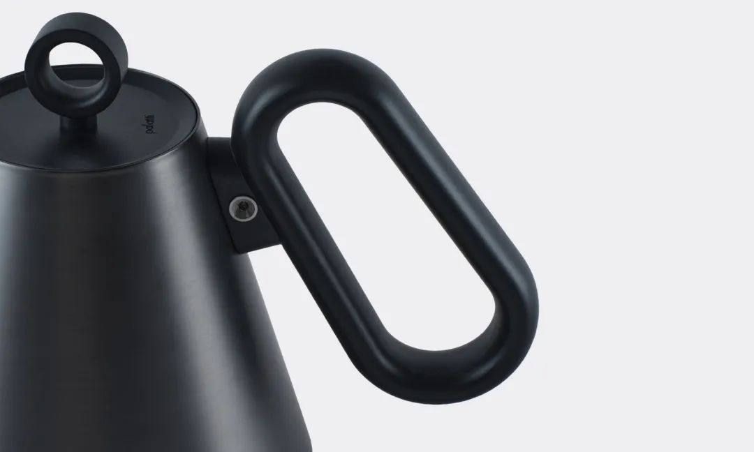 顶部狭窄、底部宽大的圆形手柄与连接点的外倾角,将握持区域靠近水壶的重心。这缩短了阻力臂,延长了提起时的作用臂。