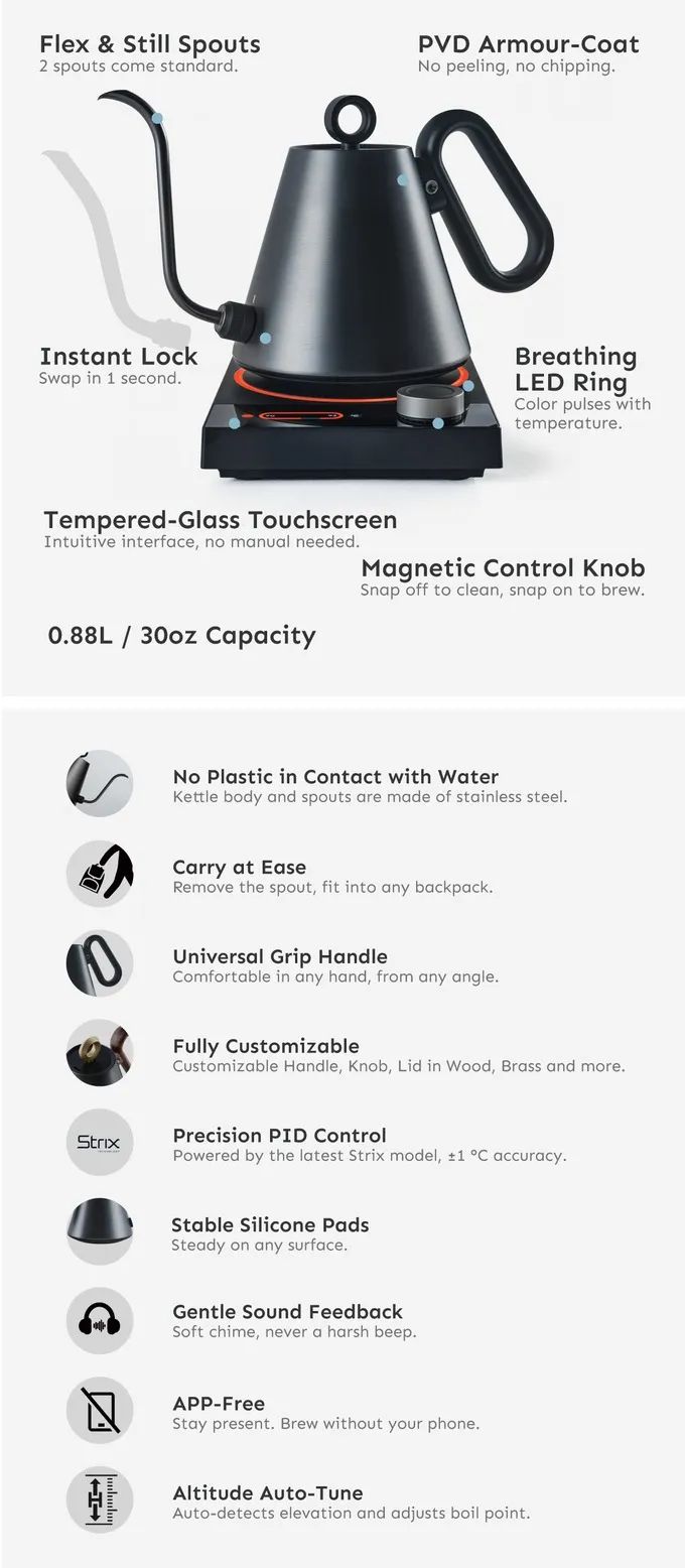 从可互换的出水嘴到直观的触控界面,从磁性旋钮到完全定制的潜力,每一个细节都经过重新构思。它不仅追求外观的震撼,更旨在满足你的冲泡需求。