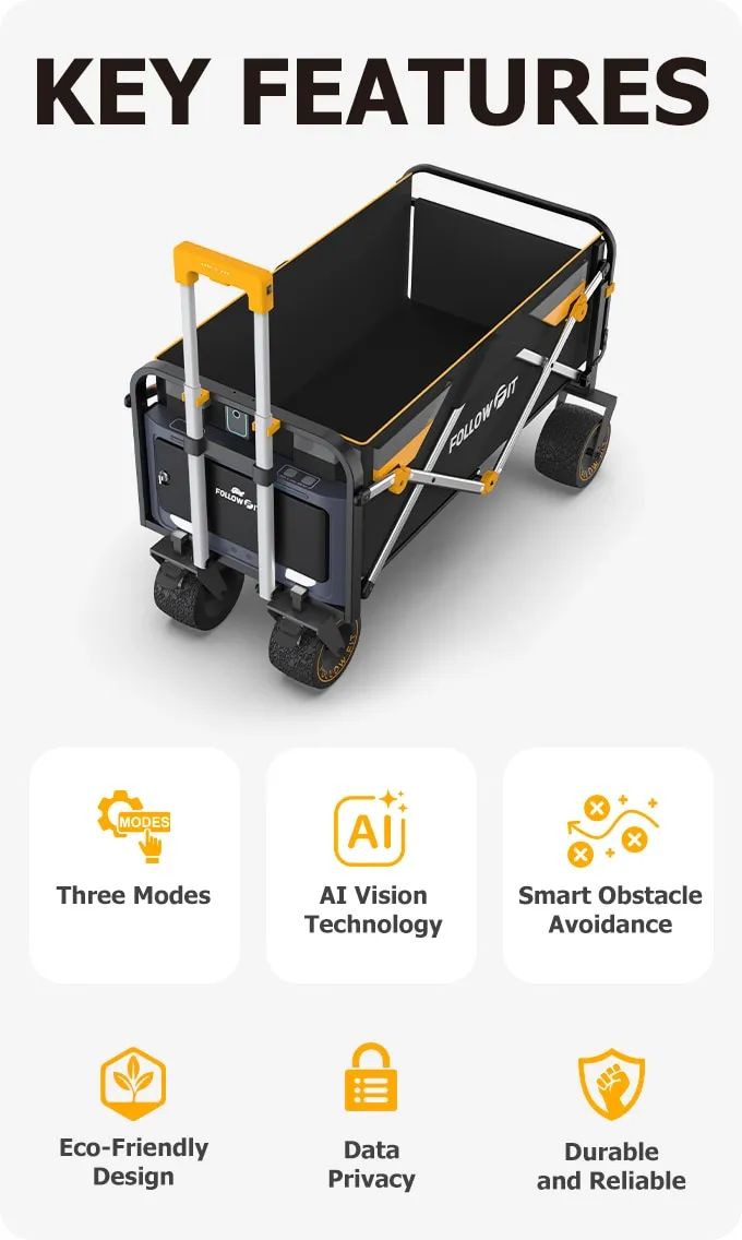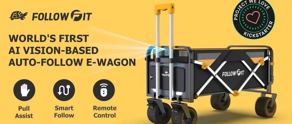 FollowFit,一款基于AI视觉的自动跟随电动露营小货车,具备智能跟随、障碍物规避、远程控制、手动辅助、一键折叠、全地形机动、自动刹车与坡道辅助等等功能。