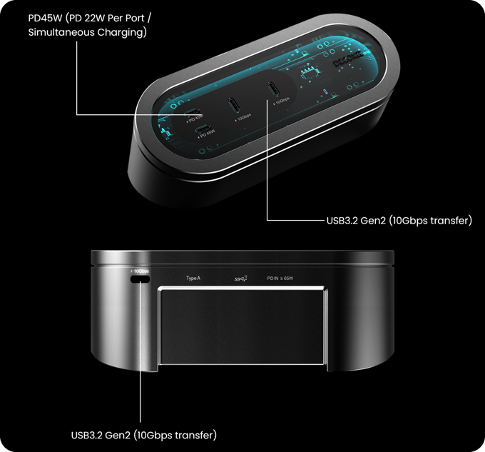 DK-HUB2配备45W双端口快速充电和双SSD托架,确保充电与数据传输高效运行。