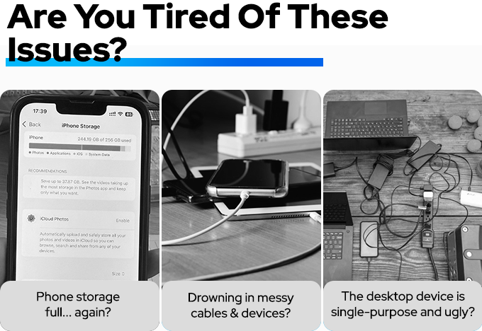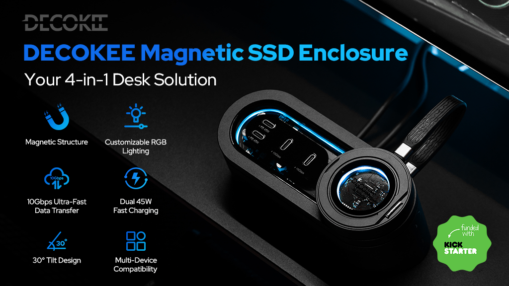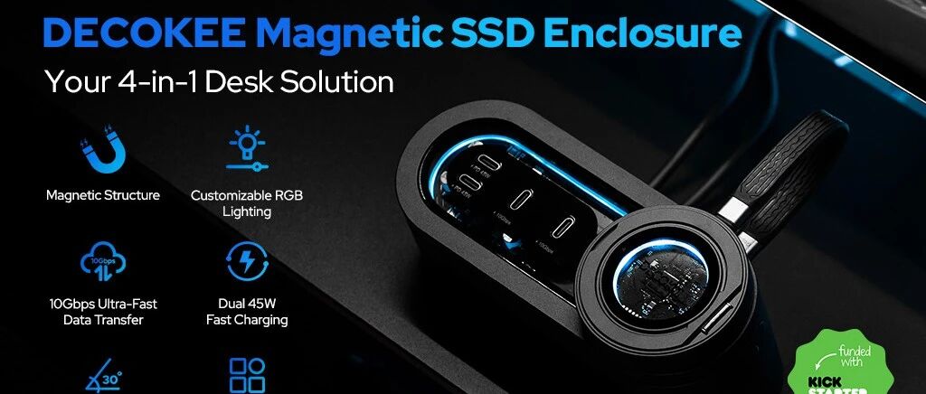 DK-DISK2磁性固态硬盘与DK-HUB2集线器通过无缝整合充电、存储、支架和环境灯四大核心功能,有效解决桌面空间有限的问题。