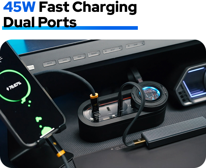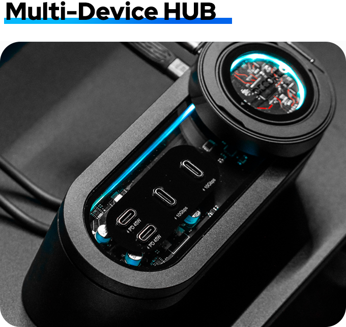 外观设计现代简洁,配备多端口,支持同时连接4个以上设备,实现高速数据传输和45W快速充电,配备透明技术面板和动态RGB灯光,彰显前沿科技感。