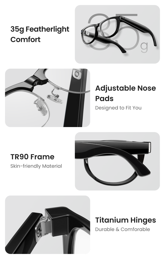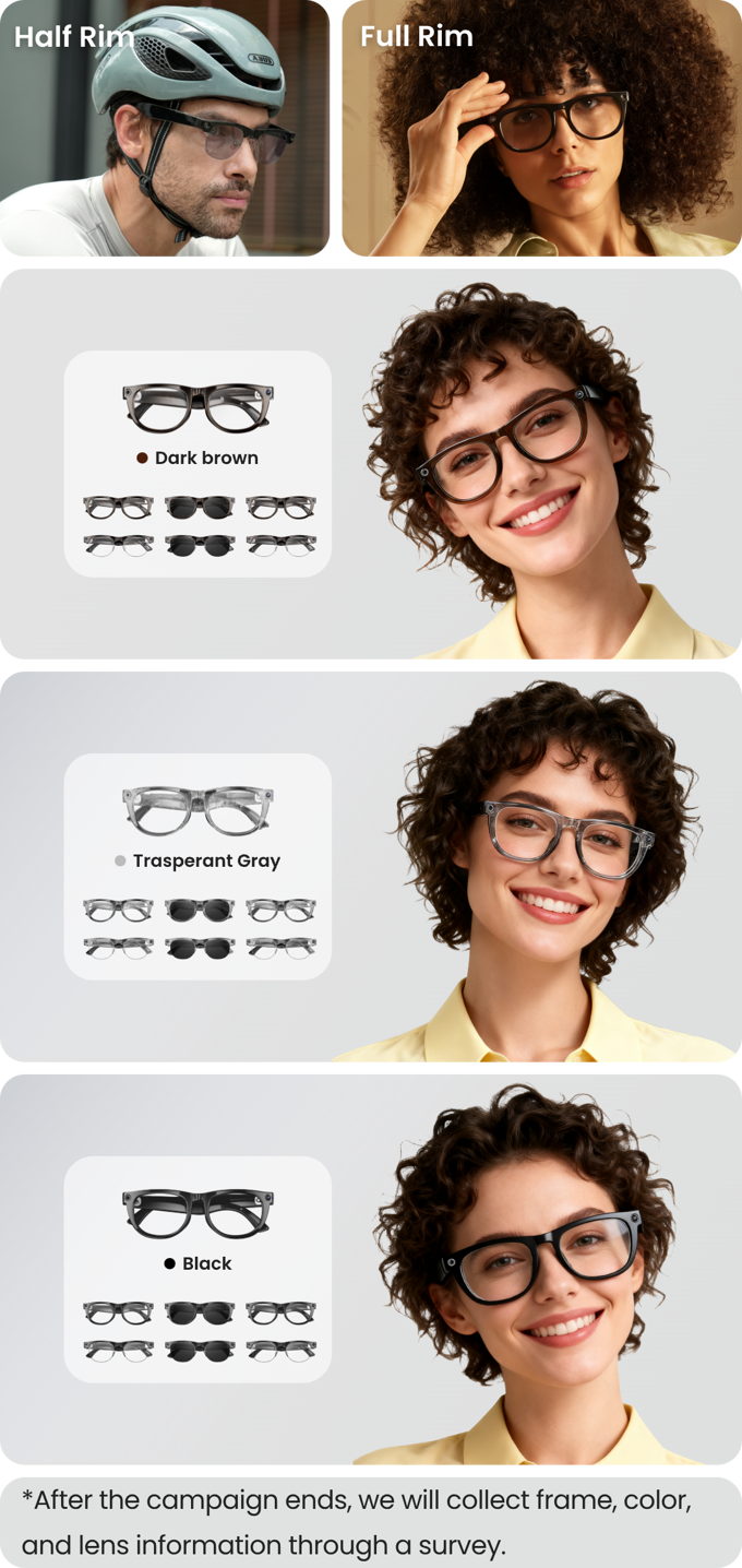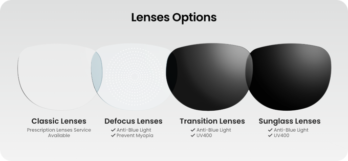多款款式可选,半框或全框,丰富色彩,配备多种镜片——满足你的个性化造型需求。提供变色镜片、太阳镜片、散焦镜片及处方镜片,兼顾防眩光、户外保护和视力矫正,灵活适应不同生活场景。