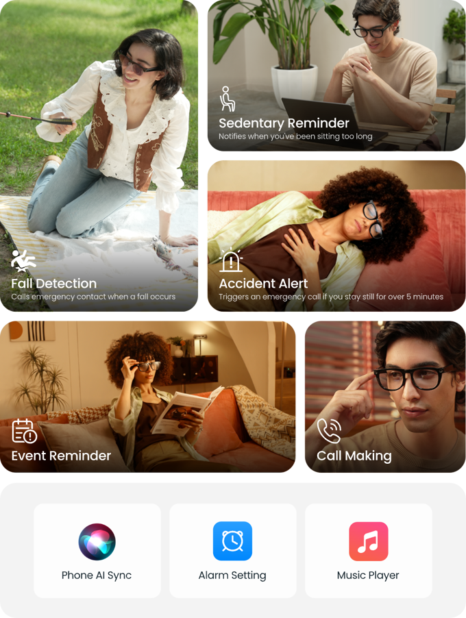 Neomix不仅是问答助手,更关心你的安全与健康。配备PPG传感器和ECG算法,全天监测你的活动状态,提前预警潜在健康风险。