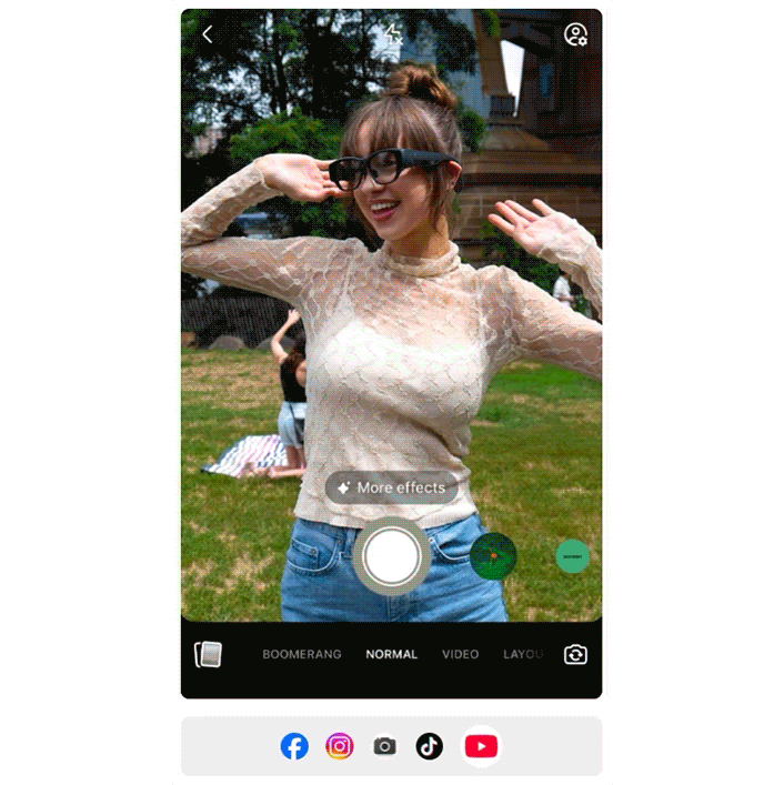 轻松从眼镜直接分享精彩瞬间,无论是拍摄后上传或实时直播社交平台,均支持。兼容90%以上的Android应用程序,如Instagram、TikTok和YouTube,全面满足多样化内容需求。