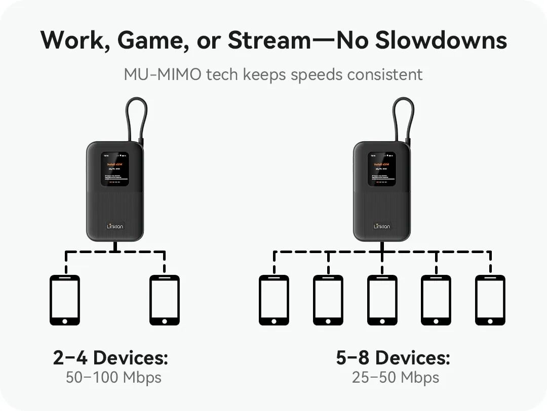 即使同时连接5-8台设备,速度依然稳定在25-50 Mbps。采用MU-MIMO技术,确保每个连接流畅、稳定且无延迟——无论设备数量是多少。