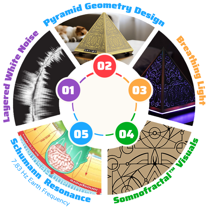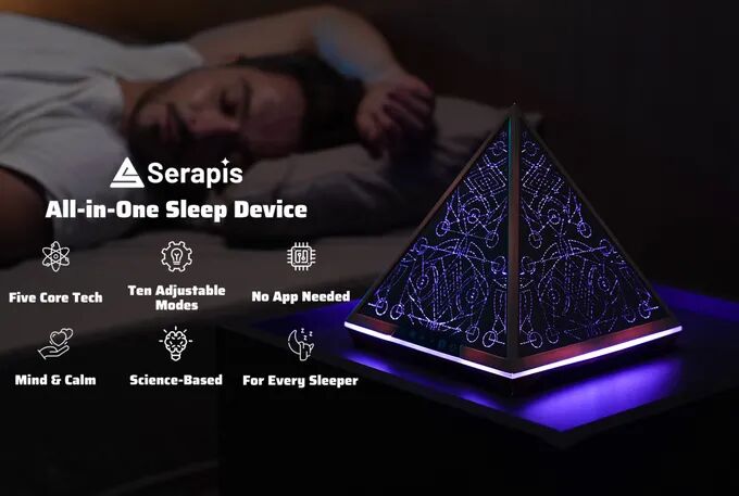 Serapis,一款以大脑自然节律为灵感的综合睡眠解决方案——融合Schumann共振频率、分层白噪声、呼吸灯、Somnofractal™视觉影像和静谧金字塔几何设计于一体的极简设备。