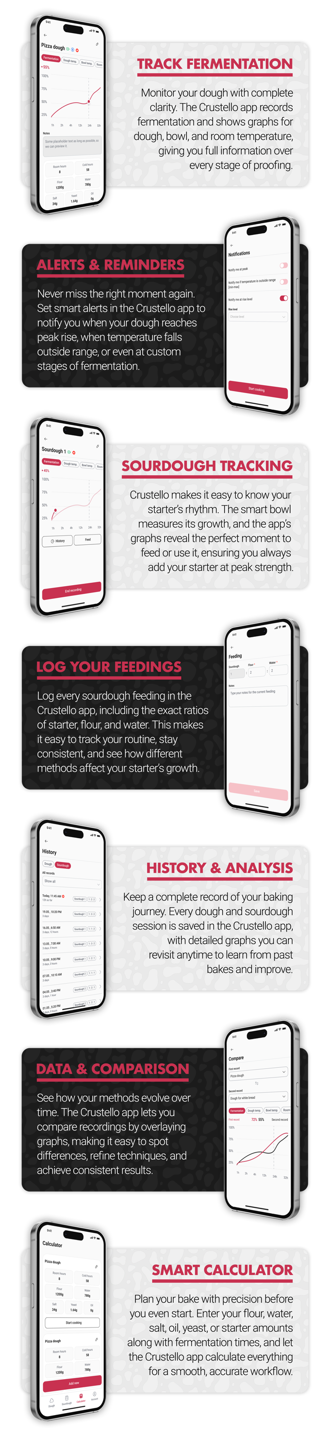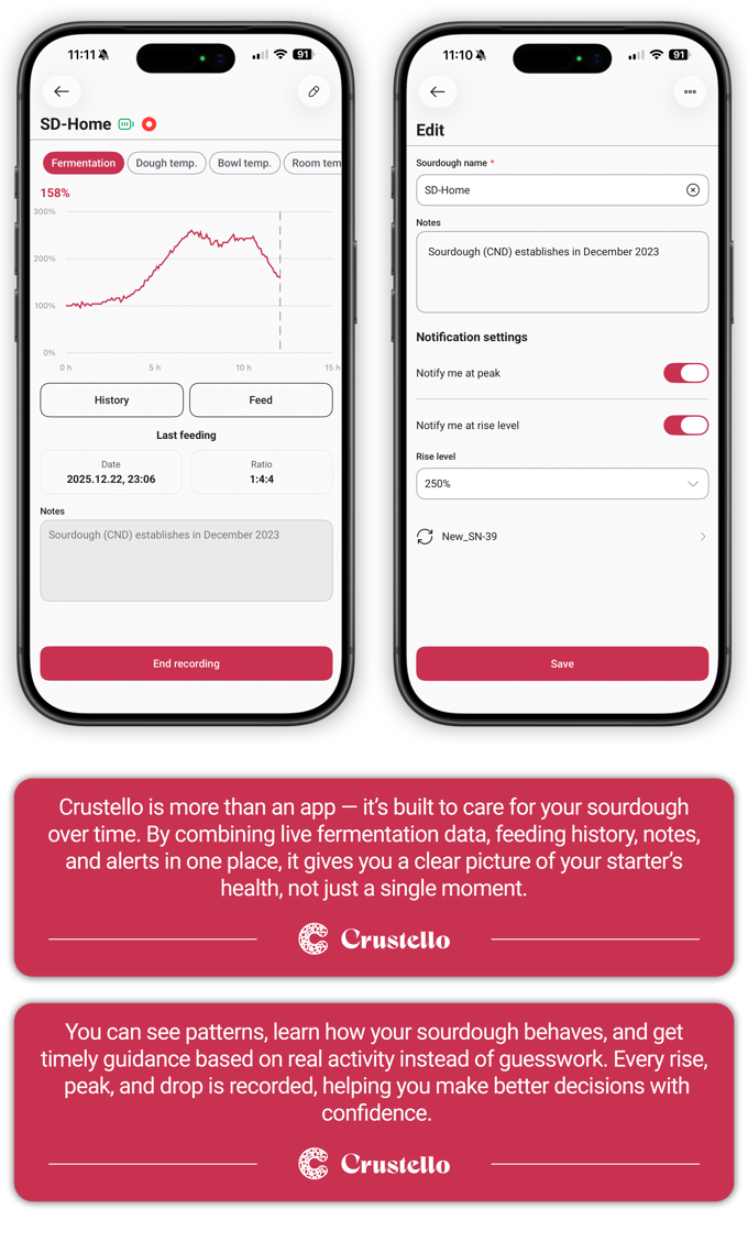 Crustello 应用程序是系统的核心,它将传感器数据转化为清晰的图表、警报和记录,为你提供酸面团与面团成长的完整信息。