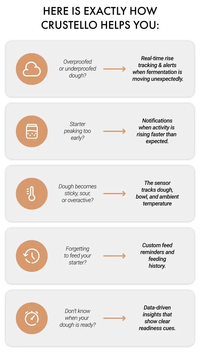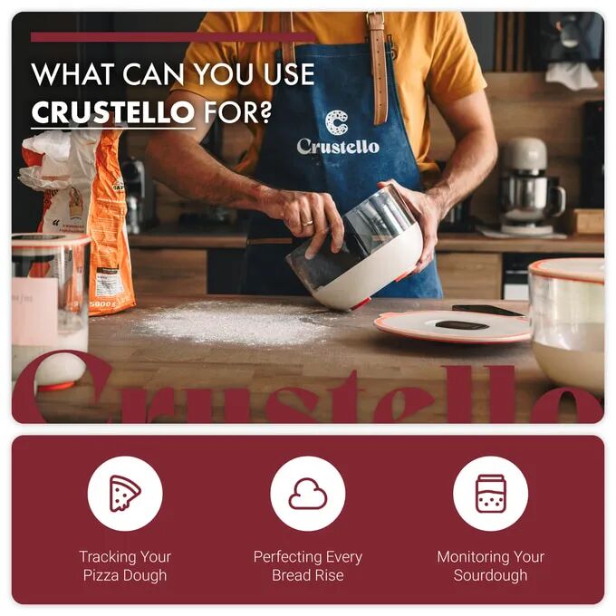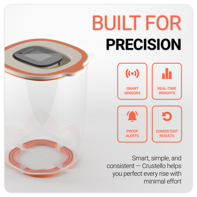 Crustello 结合尖端传感技术与直观易用的应用程序,为你提供必要的洞察与控制,助力每一次烘焙提升品质。不论是维护发酵剂、面团醒发,还是手工艺面包制作,Crustello 都是你的秘密武器。