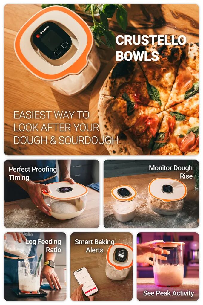 Crustello是专为面包、披萨和酸面包打造的智能面团碗。利用AI技术实时监测发酵过程中的膨胀、温度和湿度参数,确保每次发酵都完美无瑕。