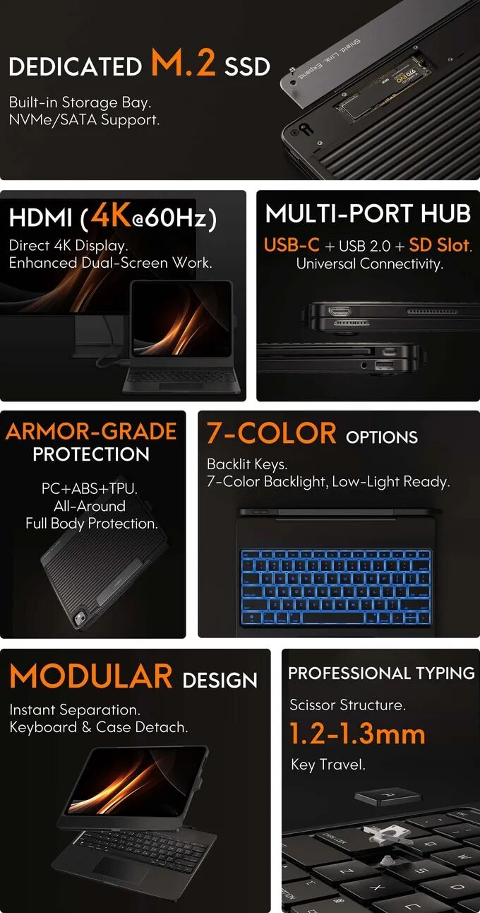 ArmorDock Pro无缝集成了多端口扩展坞、军规级保护壳和零延迟剪刀结构机械键盘,成为你不可或缺的高效工具。