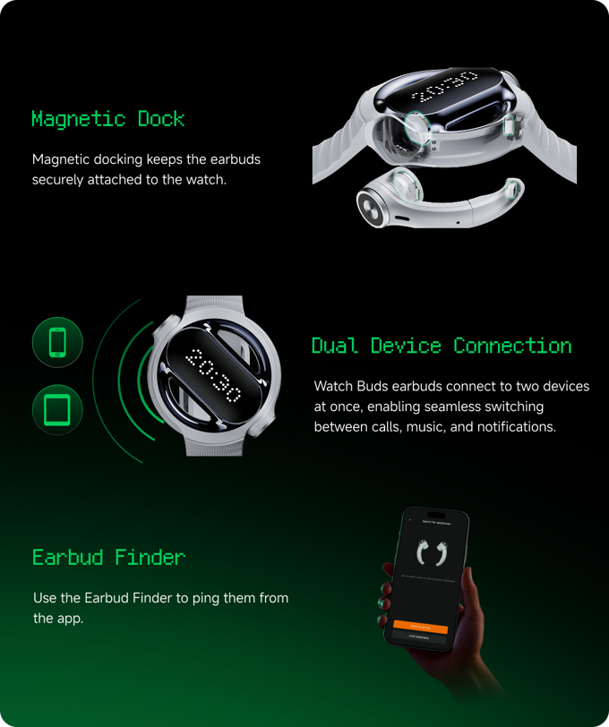 imoo Watch Buds,一款智能手表与一对开放式耳机融合于一体的创新设计。