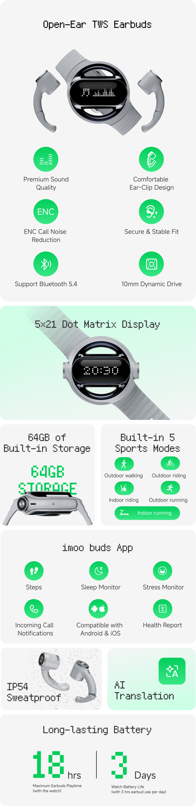 imoo Watch Buds通过优化内部布局与超轻开放式设计,成功突破这些难点。自然融合,紧凑在手腕上、贴合耳部、全天候持久续航。