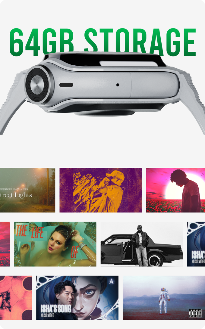 内置64GB存储空间,让你在手腕上携带超过8,000首歌曲。无论短跑、锻炼还是免提步行,音乐随时随享,无需手机或信号。