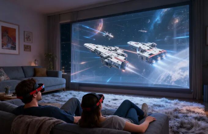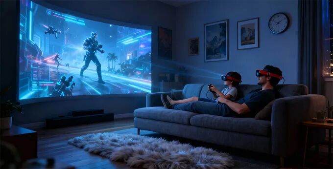 可以用多设备适配器连接两台设备,共享同一屏幕——一同玩任天堂Switch或Steam Deck,或同时观看浪漫片、喜剧和热播剧集。私人音频与300英寸影院大屏,畅享沉浸。