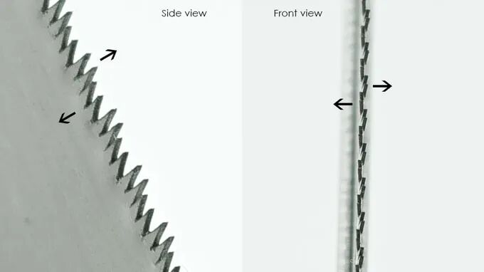 许多锯子都采用一种称为“排屑槽”的结构。这种结构通过将锯齿向左右略微弯曲,使切口比锯片厚度略宽,从而顺畅地排出木屑。然而,这种结构会产生粗糙、不平整的切割面。