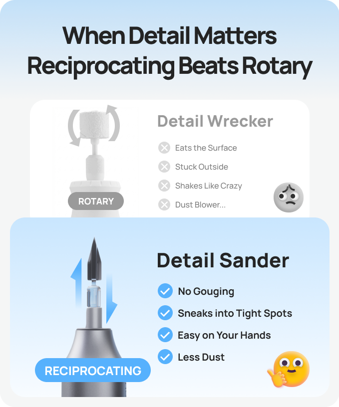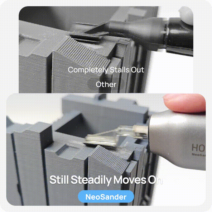 NeoSander 的直线往复运动能更高效地覆盖更大面积,快速打磨的同时,让你的工件不留划痕——非常适合精细打磨。
