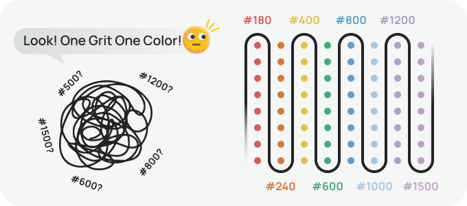 通过颜色编码组合,你的所需始终保持分类,随时可用。从粗到细,只需拿起所需的砂头,卡上即可继续打磨。