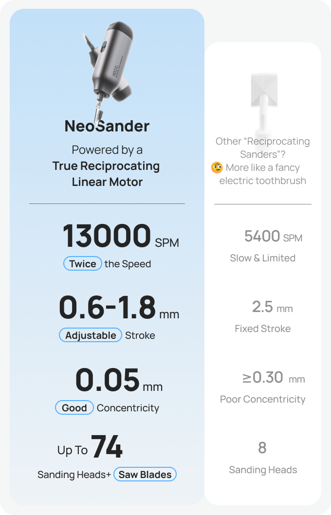 NeoSander 则完全不同:其往复式直线电机提供了其他砂光机无法比拟的最直接、最受控的行程。没有齿轮,没有连杆,没有漂移的砂头——精度有保证。