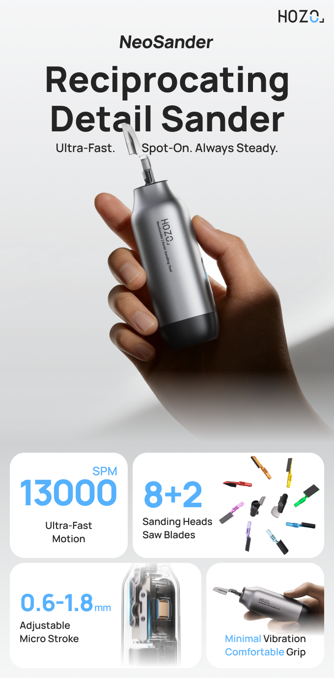 NeoSander,迷你电动往复式细节砂光机,专为精细打磨而设计。