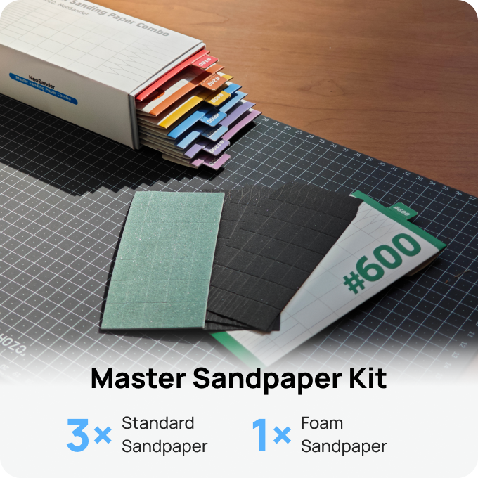 为了更好地贴合各种表面,NeoSander 开发了 Master Sandpaper Kit(主砂纸套件)。每种砂砾包含3张标准砂纸和1张海绵砂纸,能在曲面和不平整表面上提供更光滑的打磨效果和更好的接触。