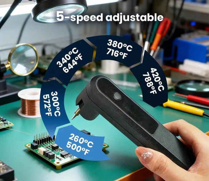 针对从精密电子产品到较重接头的各种需求,提供精确优化的设置。明亮的 LED 始终告知你温度、电量和电池状态。