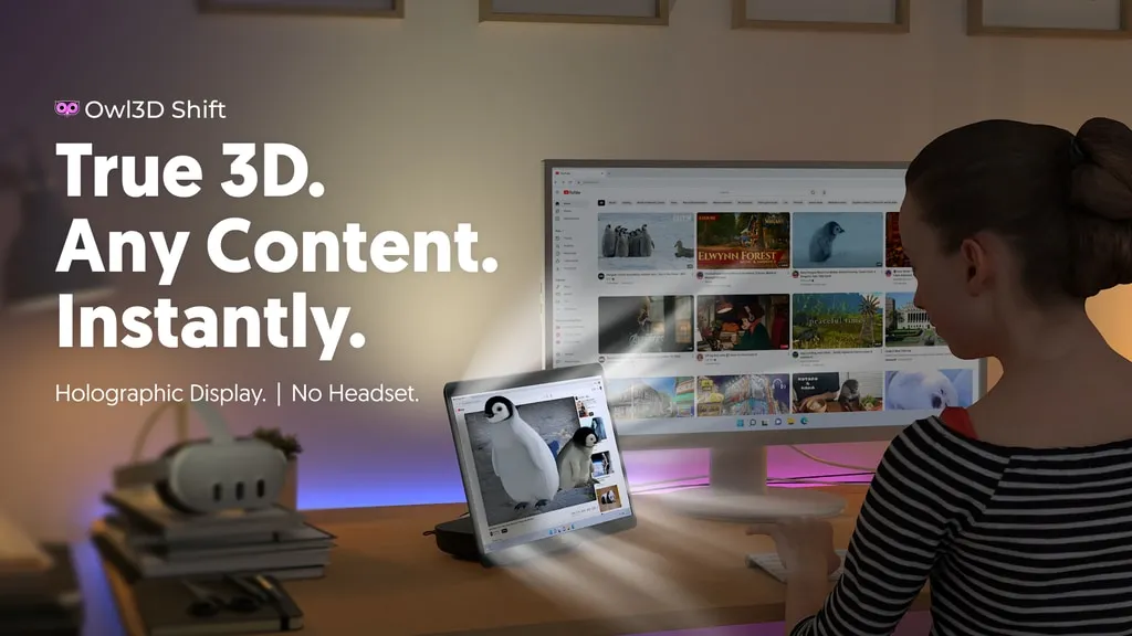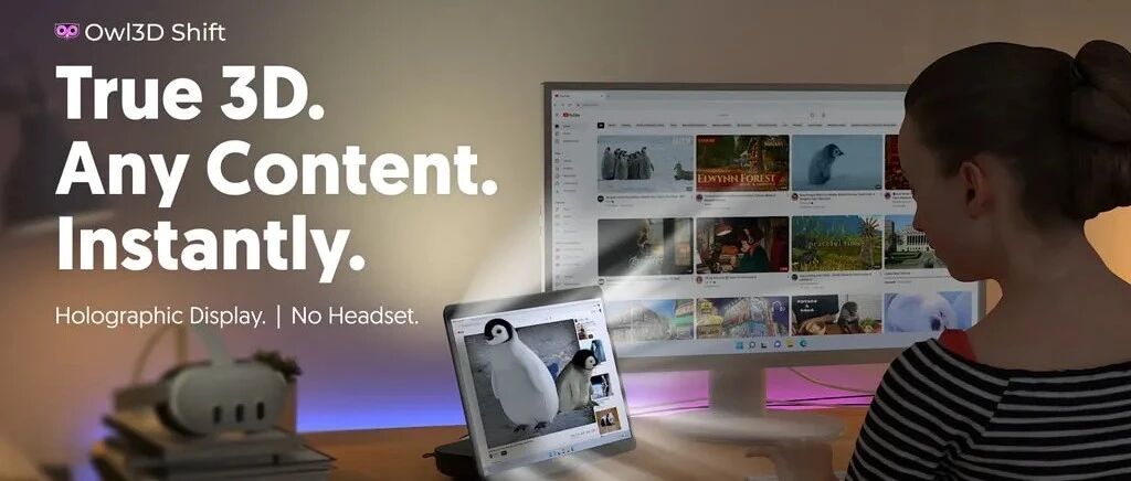 Owl3D Shift,一款一款独特的伴随式空间显示器,为你的PC打造的裸眼3D视界之窗,即刻将网页、视频与3D模型转化为真实立体影像,无需佩戴任何头戴设备。