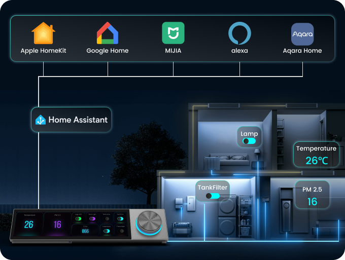 Quake轻松融入你的智能家居生态系统。通过连接Home Assistant(需API设置),你可在触屏上一键调节灯光、关闭空调等,随心改变你的环境。