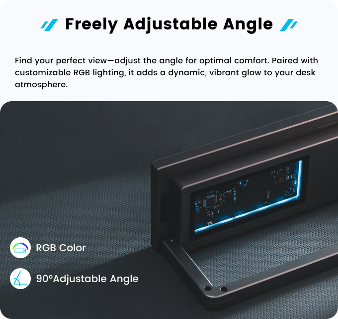 其时尚的外形融合了8.8英寸IPS屏幕与金属控制旋钮。采用全金属机身,CNC精密加工,搭配可自定义RGB灯效,它将用户导向的设计与科幻美学无缝结合,将你的桌面转变为智能、高效且充满活力的工作与娱乐空间。