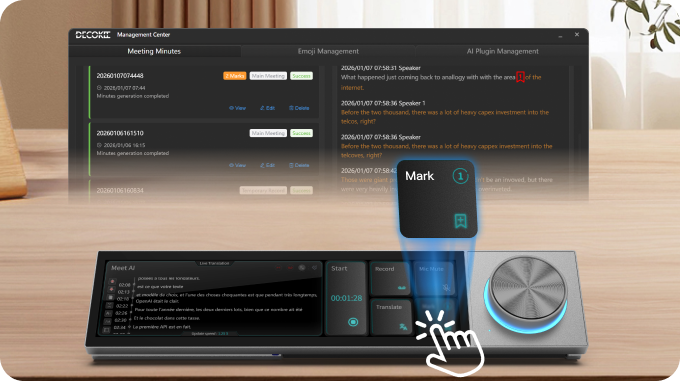 会议期间,只需点击[标记]即可突出关键信息。会议结束后,系统自动提取所有标记点,并智能生成清晰的关键要点摘要。