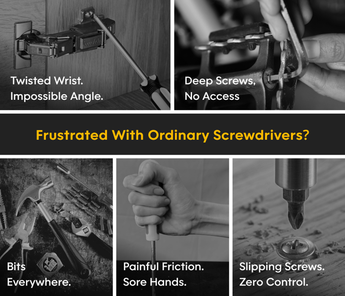 传统螺丝刀强迫你的手腕以不应有的角度操作,每次转动都迫使你停下来重新握持......