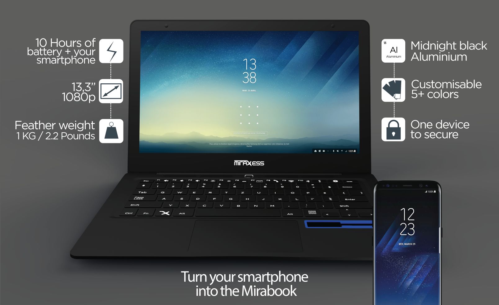 为了充分激发手机潜能,实现统一平台的真正轻办公以及便携性,法国一执着于移动设备的公司设计了 Mirabook 。