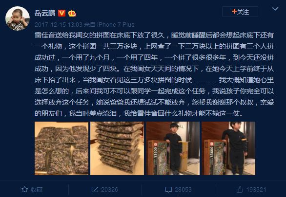 雷佳音送了岳云鹏女儿一套 3 万多片的拼图。